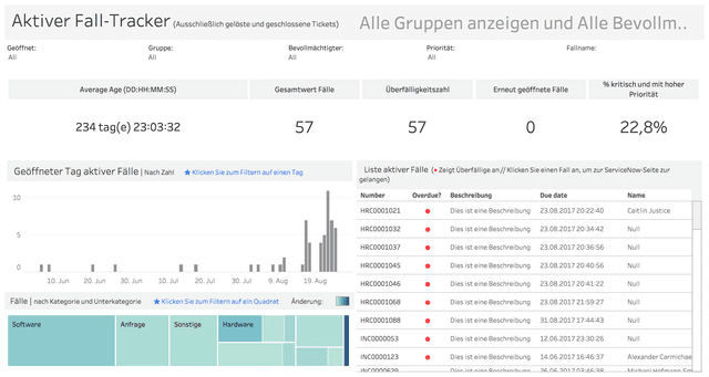 Ermöglicht das Nachverfolgen und Priorisieren von zugewiesenen Fällen. Damit können Sie die Verteilung aller aktiven Fälle nach Öffnungszeitpunkt und Kategorie sowie eine komplette Liste mit Beschreibung, Fälligkeitsdatum und Bevollmächtigten anzeigen. Durch Klicken in eine Zeile der Liste öffnen Sie die Detailseite eines Falles in ServiceNow.