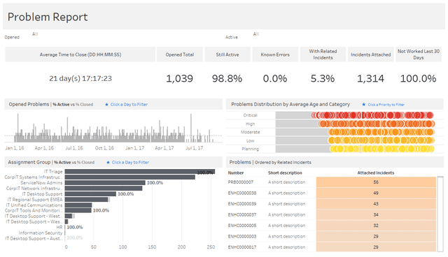 Bietet einen Überblick über alle in einem Monat eröffneten Probleme. Zeigt die Verteilung der Probleme nach Öffnungszeit, Zuweisungsgruppe, Priorität und Alter an und hilft Ihnen, problematische Bereiche zu identifizieren. Um die Auswirkungen zu verstehen, können Sie sich die Probleme mit den meisten angehängten Vorfällen anzeigen lassen und eine detaillierte Beschreibung jedes Vorfalls einsehen.