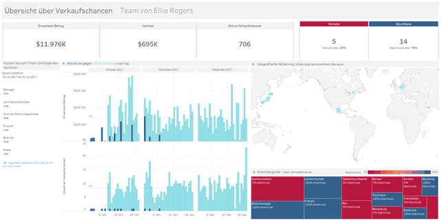 Ermöglicht das Nachverfolgen der Umsatzverteilung und der Abschlussrate von Verkaufschancen nach Standort, Branche und Abschlussdatum.