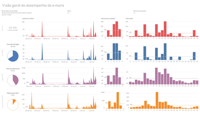 Fornece métricas da atividade de todos os programas de e-mail atuais, ajudando a visualizar o desempenho geral. Inclui detalhes principais de e-mails, como taxas de entregas, de abertura e de cliques, e exibe tendências por data, dia da semana e hora.
