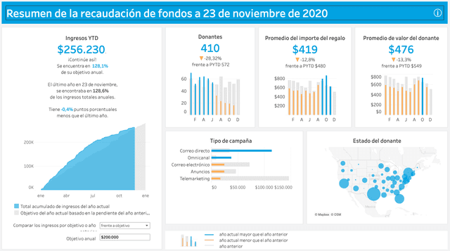 Descubra la eficacia de los datos de recaudación de fondos y comience a trabajar en cuestión de minutos con dashboards útiles sobre ingresos, donantes y campañas. Con tan solo unos pocos clics, podrá conectarse con el Nonprofit Success Pack para crear dashboards atractivos y eficaces. Estos le permitirán obtener información sobre ingresos en el tiempo, rendimiento de campañas y estadísticas de referencia referentes a los donantes y las donaciones.