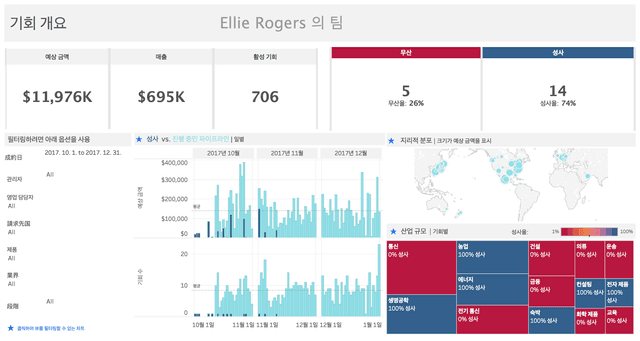 위치, 산업 및 완료 날짜별 매출 분포 및 기회 성사율을 추적합니다.