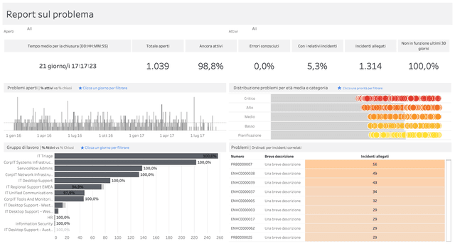 Offre una panoramica di tutti i problemi aperti in un mese. Mostra la distribuzione dei problemi per momento di apertura, gruppo assegnato, priorità ed età, aiutandoti a identificare le aree problematiche. Per capirne l'impatto, puoi osservare i problemi con gli incidenti allegati e vedere una descrizione dettagliata di ognuno.