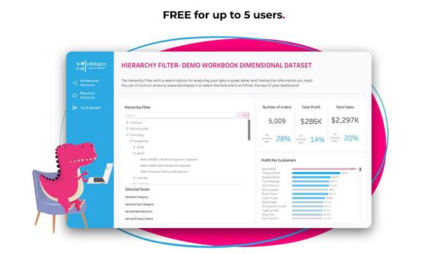 Enjoy the full potential of HierarchyFilter for free in Tableau Desktop and Web Authoring! HierarchyFilter free is completely functional and features only a discreet banner. This gives you the perfect opportunity to explore and utilize all that HierarchyFilter has to offer in Tableau before deciding to subscribe in your production environment. HierarchyFilter free is not enabled for viewers of published dashboards. To experience the full product, which will also render for Tableau viewers, Apps for Tableau is free for up to 5 users over here: https://appsfortableau.infotopics.com/getting-started/