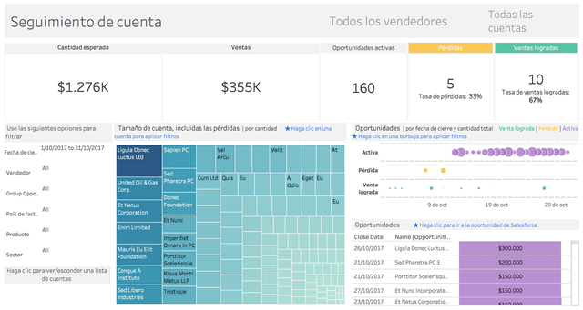Realiza un seguimiento del rendimiento de las cuentas. Puede profundizar para ver el estado de cada oportunidad y acceder a información detallada en Salesforce.