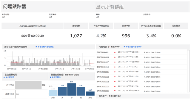 您可以借助它跟踪活跃状态的问题并确定优先事项。按开启日期和上次更新日期对问题进行细分,通过显示趋势和分布来揭示优先顺序。要评估每个问题的影响,您可以打开关联事件列表。