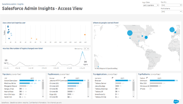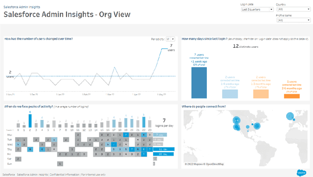 Overall Health and Activity at the Org Level looking at trends such as numbers of Distinct Users, Stale Users, Time of Day and Geo Adoption.