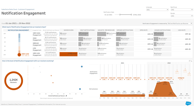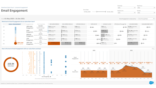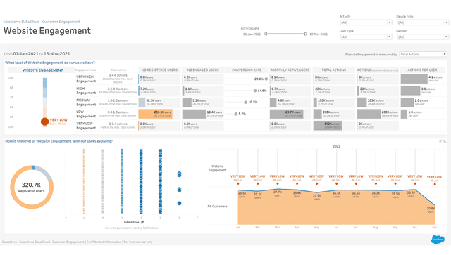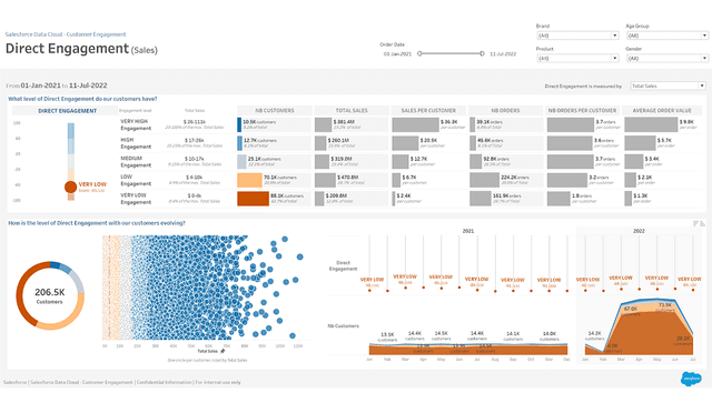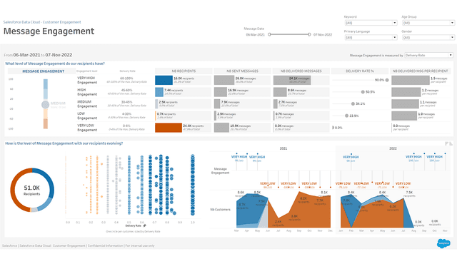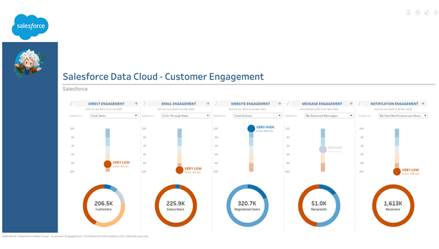 The Tableau Accelerator for Salesforce Data Cloud Customer Engagement (previously known as Salesforce CDP Customer Engagement) is a comprehensive exploratory dashboard that provides marketing and sales teams with a holistic view of the level of engagement of customers across the five channels: Sales, Email, Messages (SMS), Website and Push Notifications. It enables them to select the best channels to interact with the customer, develop relevant messaging and create positive customer experiences to increase loyalty and retention.