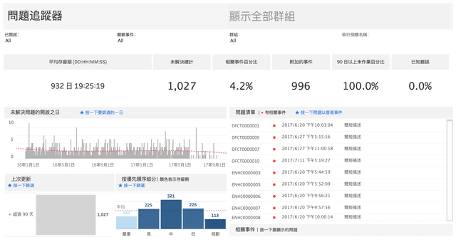 讓您追蹤活動問題並確定處理的優先順序。按開啟和最後更新日期細分問題,並透過顯示趨勢和分佈來揭示優先順序。若要評估每個問題的影響,您可以開啟附加事件清單。