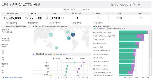 상위 계정의 실적을 지리적 위치 및 산업별로 세분화하여 추적합니다. 총계별 또는 예상 금액별로 순위를 매기거나 도구 설명 비주얼리제이션을 사용하여 세부적인 계정 기회와 타임라인을 볼 수 있습니다.
