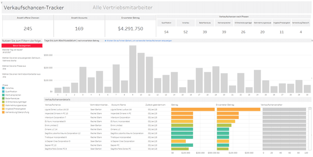 Ermöglicht die Überwachung sich anbahnender Verkaufschancen, die mit ihren Phasen, Accounts und ihrem Umfang angezeigt werden.