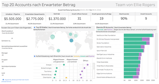 Tracks the performance of top accounts, breaking them down by geographic location and industry. Lets you rank by total or expected amounts and use Viz in Tooltip to see detailed account opportunities and timelines.