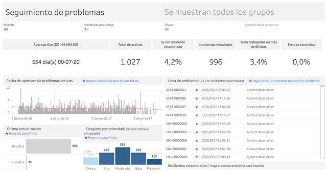 Permite realizar un seguimiento activo de los problemas y priorizar sus esfuerzos. Desglosa los problemas por fecha de apertura y de última actualización. Además, revela las prioridades mediante información sobre tendencias y distribuciones. Para evaluar el impacto de cada problema, puede abrir una lista de incidentes vinculados.