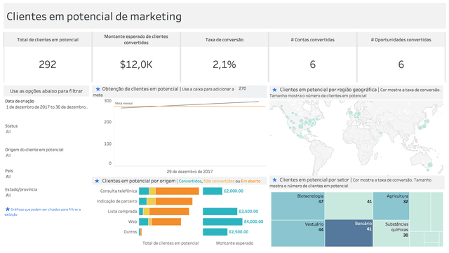 Analisa a geração de clientes em potencial e taxas de conversão por posição geográfica, origem e setor. É possível determinar e acompanhar metas mensais pelo total de clientes em potencial.