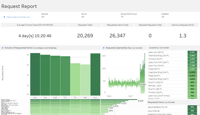 Fournit une vue d’ensemble de toutes les demandes ouvertes dans un mois. Affiche la répartition des demandes par jour de la semaine, catégorie et date d’ouverture pour mettre en évidence des tendances. Vous pouvez également découvrir les principaux emplacements et éléments demandés à l’aide de listes classées.