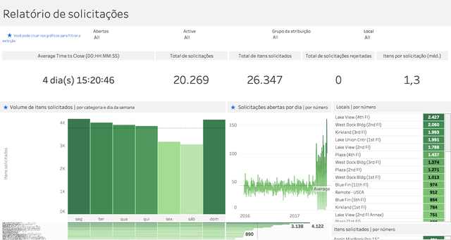 Fornece uma visão geral de todas as solicitações abertas em um mês. Exibe a distribuição de solicitações por dia da semana, categoria e data de abertura, destacando tendências. Você também pode descobrir os locais e itens mais solicitados usando as listas de classificação.
