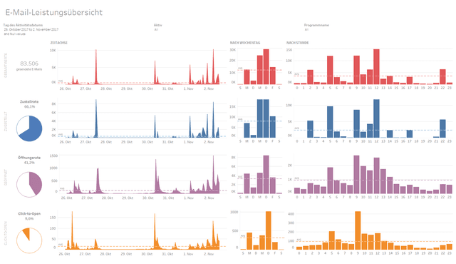 Bietet Aktivitätskennzahlen für alle aktuellen E-Mail-Programme zur Ermittlung der Gesamtleistung. Sie erhalten damit zentrale E-Mail-Details, wie Zustell-, Öffnungs- und Klickraten und Verläufe nach Datum, Wochentag und Stunde.