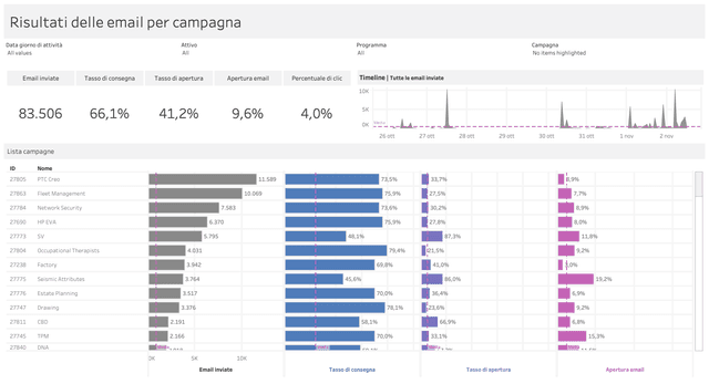 Ti permette di analizzare le performance di ogni campagna email. Mostra movimenti come le email inviate, consegnate, aperte e cliccate.