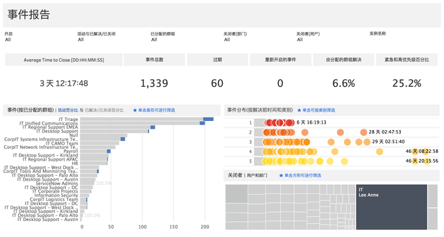 对一个月内开启的所有事件进行概述。按分配组、优先级、解决前时间以及关闭的用户和部门进行细分,快速发现趋势和异常值。