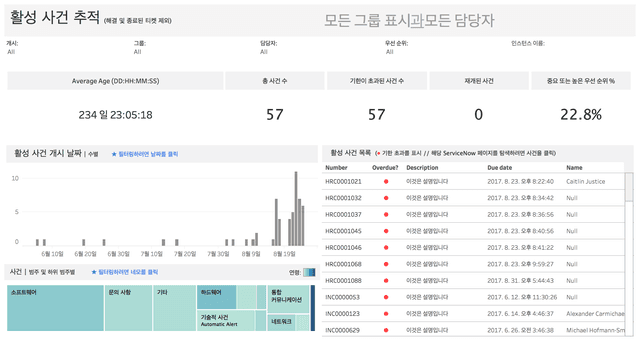 할당된 사건을 추적하고 우선순위를 부여할 수 있습니다. 모든 활성 사건의 분포를 개시 시각 및 범주별로 표시하며, 설명, 기한 및 담당자가 표시되는 전체 목록을 제공합니다. 목록에서 한 행을 클릭하면 ServiceNow의 상세한 사건 페이지가 열립니다.