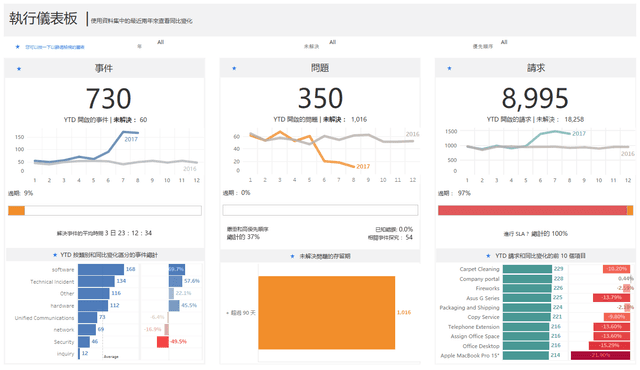 概述所有事件、問題和請求。透過年度趨勢、逾期率、平均解決時間和 SLA 百分比之類的關鍵指標,您可以快速評估支援區域的整體健康狀況。