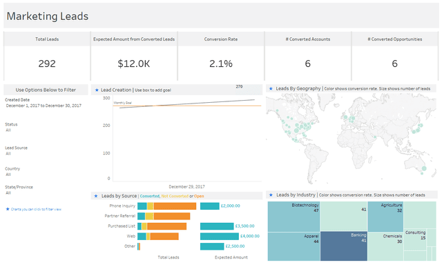 リードの生成率とコンバージョン率を、地域、ソース、および業界ごとに分析します。リードの月間目標数を設定して追跡できます。