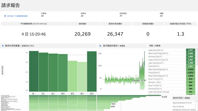 概述一個月內開啟的所有請求。按工作日、類別和開啟日期顯示請求的分佈,以突顯模式。您也可以使用排名清單找出最多請求的位置和項目。