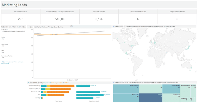 Analysiert die Lead-Generierung und Konversionsraten nach geografischer Region, Quelle und Branche. Damit können Sie monatliche Ziele für die gesamten Leads festlegen und nachverfolgen.