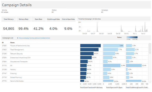 각 이메일 캠페인에 대한 세부 메트릭을 자세히 살펴봄으로써 실적을 분석할 수 있습니다. 전송된 이메일, 배달된 이메일, 열린 이메일 및 클릭한 이메일의 유입 경로를 보여주고 각 이메일 자산을 분류하여 개별 실적을 검사할 수 있는 기능을 제공합니다.