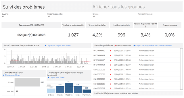 Ce tableau de bord permet de suivre les problèmes actifs et de prioriser vos actions. Les problèmes sont détaillés par date d'ouverture et date de dernière mise à jour. L'affichage des tendances et des distributions révèle les priorités. Pour évaluer l'impact de chaque problème, vous pouvez ouvrir une liste des incidents qui y sont rattachés.