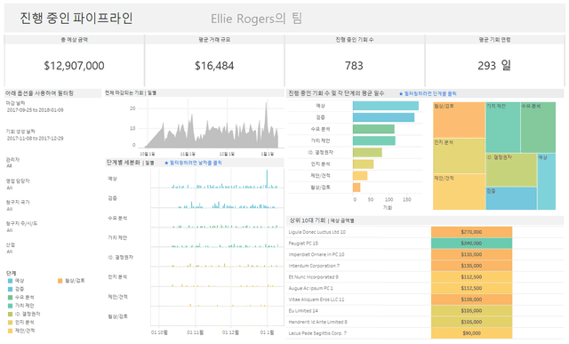 표시되는 파이프라인의 진행 단계를 통해, 판매 주기에서 일어날 가능성이 있는 손실분을 식별할 수 있습니다. 매일의 파이프라인 추세를 확인하고, 각 단계 또는 완료 날짜로 드릴다운하여 최상의 기회를 검토할 수 있습니다.