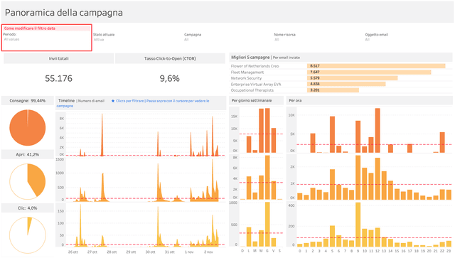 Mostra l'attività di tutte le attuali campagne email, aiutandoti a capire le performance generali delle campagne. Offre metriche chiave come percentuali di consegna, apertura e di clic, e mostra i trend per data, giorno settimanale e ora.