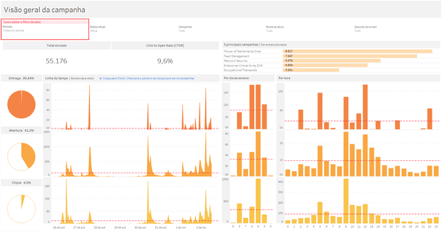 Exibe a atividade de todas as campanhas de e-mail atuais, ajudando a visualizar o desempenho geral da campanha. Fornece métricas principais como taxas de entrega, de abertura e de cliques, e exibe tendências por data, dia da semana e hora.