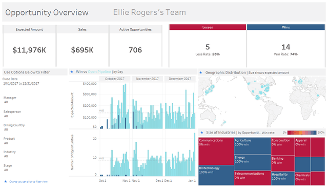 Volgt de verkoopdistributie en het percentage gewonnen opportunity's op basis van locatie of industrie, en sluitingsdatum.
