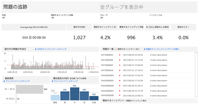 対応中の問題を追跡し、優先順位を付けられます。オープン日および最終更新日に基づいて問題の詳細を確認し、傾向や分布に基づいて優先順位を把握できます。また、関連性の高いインシデントのリストを表示し、各問題の影響を調べることも可能です。