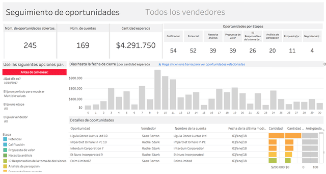 Supervisa las oportunidades futuras y muestra aquellas que se cerrarán pronto. Asimismo, brinda información sobre la etapa, la cuenta y el tamaño.