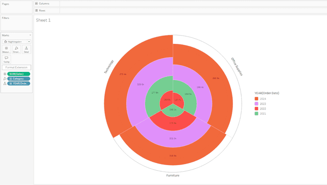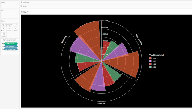 Le graphique Nightingale est une visualisation circulaire conçue pour mettre en évidence la magnitude relative des catégories, en utilisant des segments radiaux dont la longueur est proportionnelle à la valeur mesurée. Il est particulièrement efficace pour comparer les répartitions dans différentes catégories.