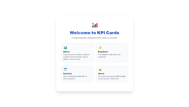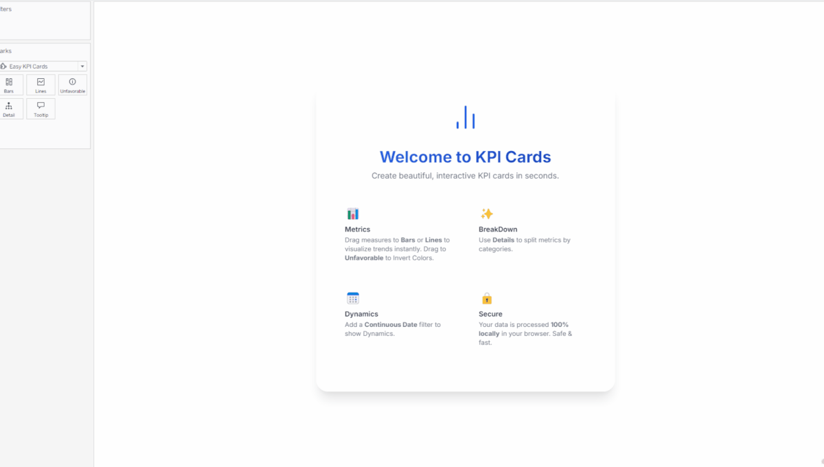 Easy KPI Cards is a Tableau extension that transforms hours of manual work into minutes. Create beautiful, interactive KPI cards with instant comparisons (YoY, MoM, QoQ), auto segmentation, and built-in period calculations (MTD, QTD, YTD, Rolling) — all without complex calculated fields or LOD expressions. The extension processes all data locally in your browser, ensuring complete privacy and security. No data is collected, stored, or transmitted to external servers.