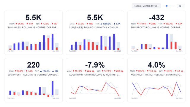 - Instant Comparisons: YoY, MoM, QoQ — no calculations needed. Just drag measures to Bars or Lines.