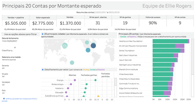 Acompanha o desempenho das principais contas, detalhando por localização geográfica e setor. Você pode classificar por valores totais ou esperados, e usar a visualização na dica de ferramenta para ver oportunidades detalhadas da conta e linhas de tempo.