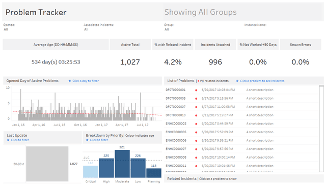 Lets you track active problems and prioritize your efforts. Breaks down problems by opened and last-updated dates, and reveals priorities by showing trends and distributions. To assess the impact of each problem, you can open a list of attached incidents.
