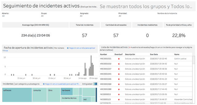 Permite realizar un seguimiento de los incidentes asignados y darles prioridad. Muestra la distribución de todos los incidentes activos por hora de apertura y categoría. También proporciona una lista completa que incluye descripción, fecha de expiración y empleado asignado. Haga clic en cualquier fila de la lista para abrir la página de detalles de incidentes en ServiceNow.