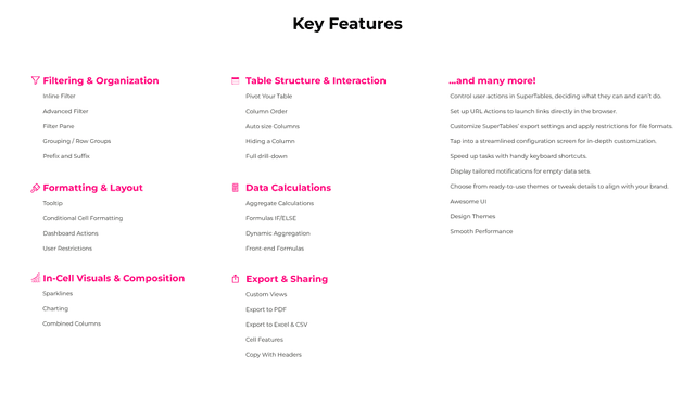 With the SuperTables extension for Tableau, you can offer your dashboard users the power of interactive and dynamic Excel-like tables that allow users to decide how to organize and analyse their data in a flexible grid using the features just like in Excel and without leaving Tableau! Enrich your dashboards in a secure and governed way with the SuperTables extension for Tableau and allow your visitors to do their own analysis with the summarised data of your visualisations. Let your users group data, pivot tables, use inline filters on columns, expand rows and export to pdf, csv and Excel while using the SuperTables formatting. This fast performing table enriches your dashboards with extra context to your dashboards without any boundaries. It supports dashboard actions, it makes sure your calculations on aggregated data are correct and it offers your users the possibility to store their personal views on Tableau Server or Cloud so they can start tomorrow where they stopped today. SuperTables supports keyboard navigation and has lots of accessibility features!