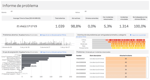 Proporciona un resumen de todos los problemas abiertos en un mes. Muestra la distribución de los problemas por hora de apertura, grupo de asignación, prioridad y antigüedad. Esto ayuda a identificar áreas problemáticas. Para analizar el impacto, puede ver los problemas con más incidentes asociados y acceder a una descripción detallada de cada uno.