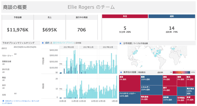 営業分布や、所在地または業種ごとの商談成約率、およびクローズ日を追跡します。