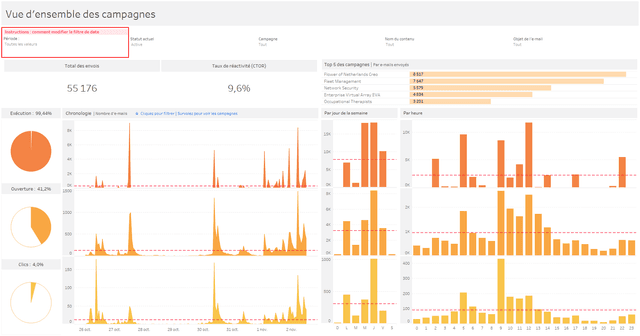 Ce tableau de bord présente les activités de toutes les campagnes e-mail en cours, ce qui vous permet d'analyser leurs performances globales. Il fournit des indicateurs essentiels comme les taux de livraison et d'ouverture, ou encore le CTR, et montre les tendances par date, jour de la semaine et heure.