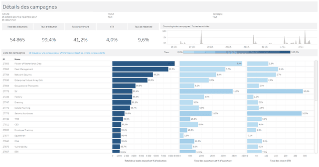 Ce tableau de bord permet d'analyser les indicateurs en détail pour chaque campagne d'e-mails en vue d'analyser les performances. Il montre l'entonnoir des e-mails envoyés, livrés, ouverts et ayant fait l'objet de clics, et vous permet d'examiner les performances de chaque e-mail.
