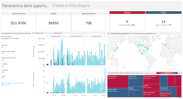 Monitora la distribuzione di vendita e il tasso di vittoria delle opportunità per luogo, industria e data di chiusura.