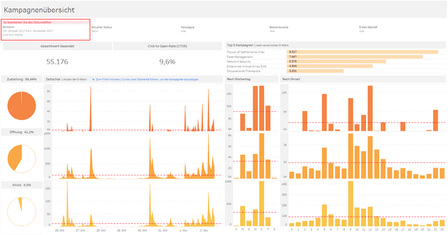Zeigt die Aktivität für alle aktuellen E-Mail-Kampagnen an und bietet so einen Einblick in die allgemeine Kampagnenleistung. Sie erhalten damit Schlüsselkennzahlen, wie Zustell-, Öffnungs- und Klickraten sowie Verläufe nach Datum, Wochentag und Stunde.