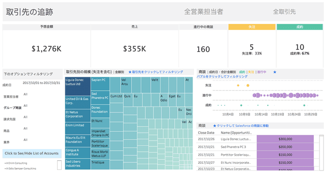 取引先に関するパフォーマンスを追跡します。ドリルダウンして各商談のステータスを確認したり、Salesforce 内の詳細情報にアクセスしたりできます。